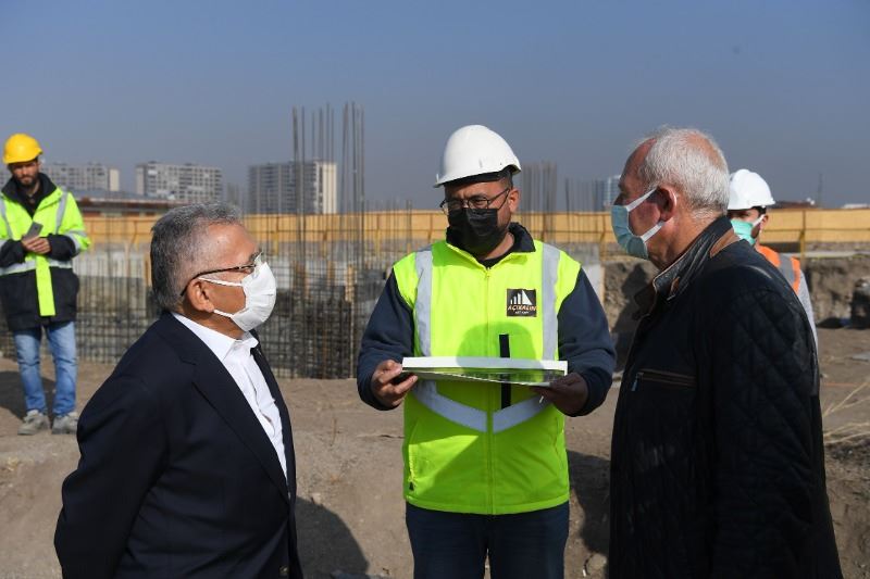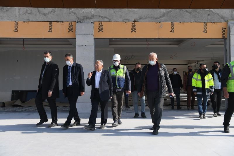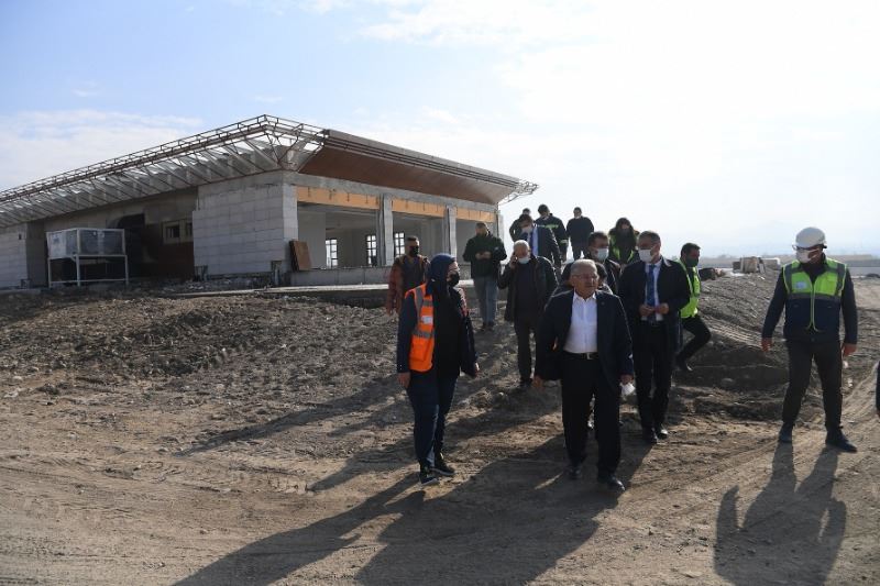 Kıraathane inşaatını gezen Büyükkılıç, Genel Sekreter Yardımcısı Hamdi Elcuman ve yüklenici firma yetkililerinden bilgiler aldı.