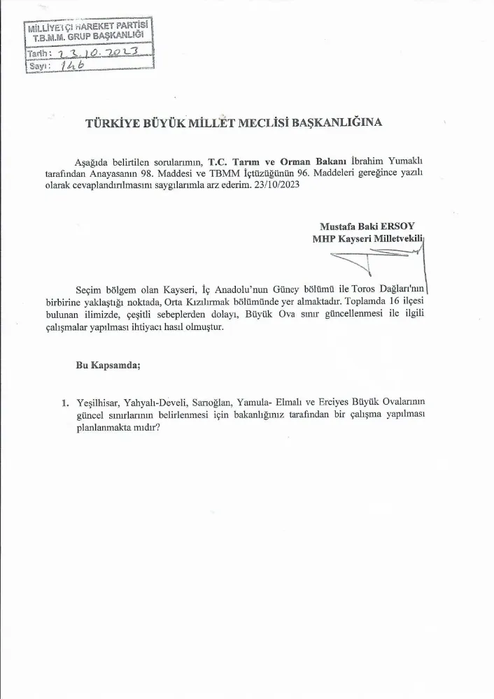 Baki Ersoy konuyla ilgili yaptığı açıklamada, "Yeşilhisar, Yahyalı-Develi, Sarıoğlan, Yamula- Elmalı ve Erciyes Büyük Ovalarının güncel sınırlarının belirlenmesi ve çiftçilerimizin ve ziraat ile uğraşan vatandaşlarımızın mağduriyetlerinin giderilmesi için yazılı soru önergemizi; Tarım ve Orman Bakanı Sayın İbrahim Yumaklı'ya iletmiş bulunmaktayız. Konunun takipçisi olacağız" dedi.