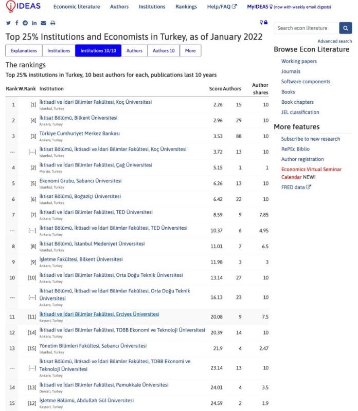 ERÜ İktisadi ve İdari Bilimler Fakültesi Öğretim üyelerinin Ekonomi, İşletme, Maliye, Enerji ve Çevre alanlarındaki çalışmaları ile literatür taraması yapan uluslararası Ideas RePEc (St Louis of Federal Reserve Bank) tarafından Türkiye’deki 235 kurum arasından 11.sırada yer alma başarısını gösterdi.