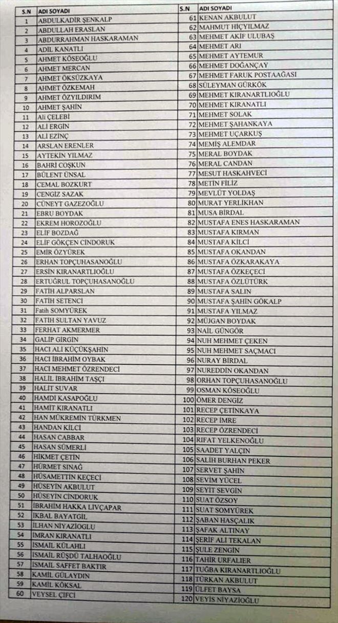 Göz atlına alınan zanlıların ev ve iş yerlerinde başlatılan aramalar sürerken Ak Parti ESKİ Milletvekili Ahmet Öksüzkaya ve Fatih Üniversitesi eski Rektörü Şerif Ali Tek´in aralarında bulunduğu bazı isimlerin firarda olduğu öğrenilirken göz altına alınan isimler şöyle listelendi?. Abdulkadir Ş., Abdullah E., Abdurrahman H., Adil K., Ahmet K., Ahmet M., Ahmet Ö., Ahmet Ö., Ahmet Ö., Ahmet Ş., Ali Ç., Ali E.,Ali E., Arslan E., Aytekin Y., Bahri C., Bülent Ü., Cemal B., Cengiz S., Cüneyt G., Ebru B., Ekrem H., Elif B., Elif G., Emir Ö., Erhan T., Ersin K., Ertuğrul T., Fatih A., Fatih S., Fatih S., Fatih S.Y., Ferhat A., Galip G., Hacı Ali K., Hacı İbrahim O., Hacı Mehmet Ö.,Halil İbrahim T., Halit S., Hamdi K., Hamit K., Han Mükremin T., Handan K., Hasan C., Hasan S., Hikmet Ç., Hürmet S., Hüsamettin K., Hüseyin A., Hüseyin C., İbrahim Hakka L., İkbal B., İlhan N., İmran K., İsmail K., İsmail Rüşdü T., İsmail Saffet B., Kamil G., Kamil K., Veysel Ç., Kenan A., Mahmut H., Mehmet Akif U., Mehmet A., Mehmet A., Mehmet D., Mehmet Faruk P., Süleyman G., Mehmet K., Mehmet K., Mehmet S., Mehmet Ş., Mehmet U., Memiş A., Meral B., Meral C., Mesut H., Metin F., Mevlüt Y., Murat Y., Musa B., Mustafa Enes H., Mustafa K., Mustafa K. Mustafa O., Mustafa Ö., Mustafa Ö., Mustafa Ö., Mustafa S., Mustafa Şahin G., Mustafa Y., Müjgan B., Nail G., Nuh Mehmet Ç., Nuh Mehmet S., Nuray B., Nurettin O., Orhan T., Osman K., Ömer D., Recep Ç., Recep İ., Recep Ö., Rıfat Y., Saadet Y., Salih Burhan P., Servet Ş., Sevim Y., Seyit S., Suat Ö., Suat S., Şaban H., Şafak A., Şerif Ali T., Şule Z., Tahir U., Tuğba K., Türkan A., Ülfet B., Veyis N.