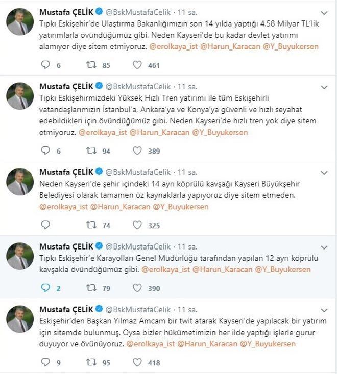 Kayseri Büyükşehir Belediye Başkanı Mustafa Çelik de, bir gün sonra Büyükerşen´e resmi twitter adresi üzerinden yanıt verdi. Büyükerşen´e ?Yılmaz Amcam´ diye hitap eden Çelik, Miraç Kandili kutlamayı da ihmal etmedi. Başkan Çelik, Büyükerşen´e, "Eskişehir´den Başkan Yılmaz Amcam bir twit atarak Kayseri´de yapılacak bir yatırım için sitemde bulunmuş. Oysa bizler hükümetimizin her ilde yaptığı işlerle gurur duyuyor ve övünüyoruz. Tıpkı Eskişehir´e Karayolları Genel Müdürlüğü tarafından yapılan 12 ayrı köprülü kavşakla övündüğümüz gibi. Neden Kayseri´de şehir içindeki 14 ayrı köprülü kavşağı Kayseri Büyükşehir Belediyesi olarak tamamen öz kaynaklarla yapıyoruz diye sitem etmeden. Tıpkı Eskişehirmizdeki Yüksek Hızlı Tren yatırımı ile tüm Eskişehirli vatandaşlarımızın İstanbul´a, Ankara´ya ve Konya´ya güvenli ve hızlı seyahat edebildikleri için övündüğümüz gibi. Neden Kayseri´de hızlı tren yok diye sitem etmiyoruz. Tıpkı Eskişehir´de Ulaştırma Bakanlığımızın son 14 yılda yaptığı 4.58 milyar TL´lik yatırımlarla övündüğümüz gibi. Neden Kayseri´de bu kadar devlet yatırımı alamıyor diye sitem etmiyoruz. Bu örnekleri daha da çoğaltmak mümkün. Ama mübarek gecede amcam yaşındaki Yılmaz Başkanımın ellerinden öpüyor kandilini kutluyorum" şeklindeki tweet mesajlarıyla yanıt verdi.