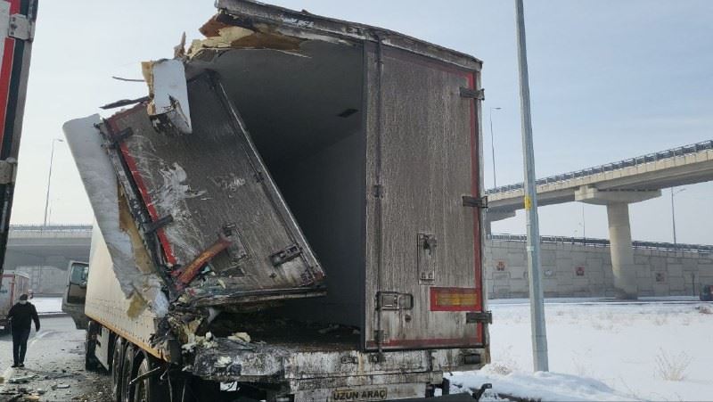 Kayseri’nin Kocasinan ilçesinde meydana gelen kazada, sürücüsünün direksiyon hakimiyetini kaybederek önündeki tırın dorsesine çarpan tır kağıt gibi ezildi.