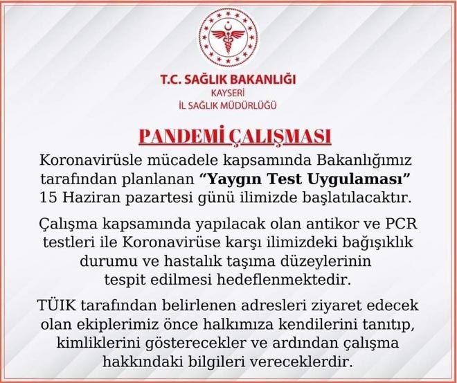 Yapılan açıklamada; Korona virüsle mücadele kapsamında bakanlığımız tarafından planlanan 'Yaygın Test Uygulaması' 15 Haziran Pazartesi günü ilimizde başlatılacaktır. Çalışma kapsamında yapılacak olan antikor, ve PCR testleri ile korona virüse karşı ilimizdeki bağışıklık durumu ve hastalık taşıma düzeylerinin tespit edilmesi hedeflenmektedir. TÜİK tarafından belirlenen adresleri ziyaret edecek olan ekiplerimiz önce halkımıza kendilerini tanıtıp kimliklerini gösterecekler ve ardından çalışma hakkındaki bilgileri vereceklerdir" denildi.