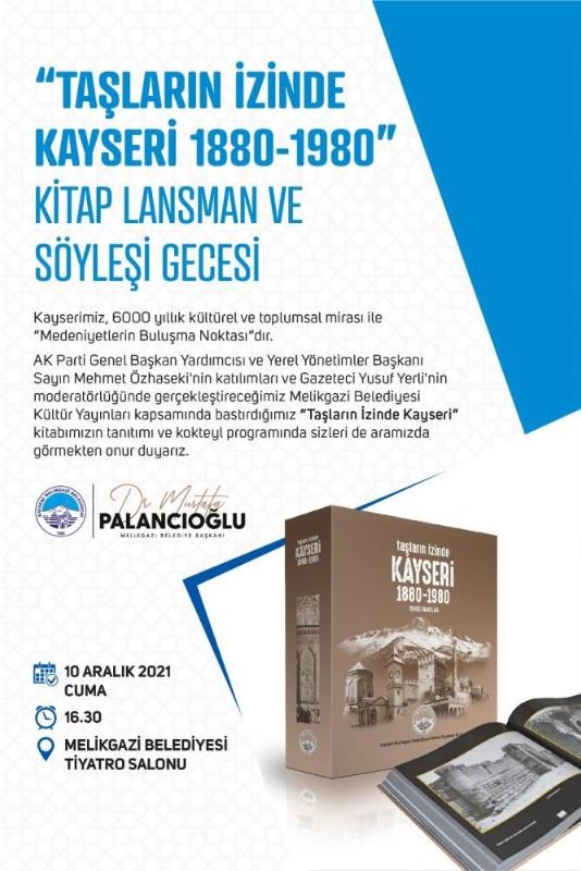 Yine 10 Aralık Cuma günü saat 16.30 Kitap Lansmanı ve Söyleşi Gecesi yapacaklarını da söyleyen Başkan Dr. Palancıoğlu, “AK Parti Genel Başkan Yardımcısı ve Yerel Yönetimler Başkanı Sayın Mehmet Özhaseki’nin katılımları ve Gazeteci Yusuf Yerli’nin moderatörlüğünde gerçekleştireceğimiz Melikgazi Belediyesi Kültür Yayınları kapsamında bastırdığımız ‘Taşların İzind4e Kayseri’ kitabımızın tanıtımı ve kokteyl programını yapacağız. Bu güzel söyleşi programına tüm Kayserilileri bekleriz” diye konuştu.