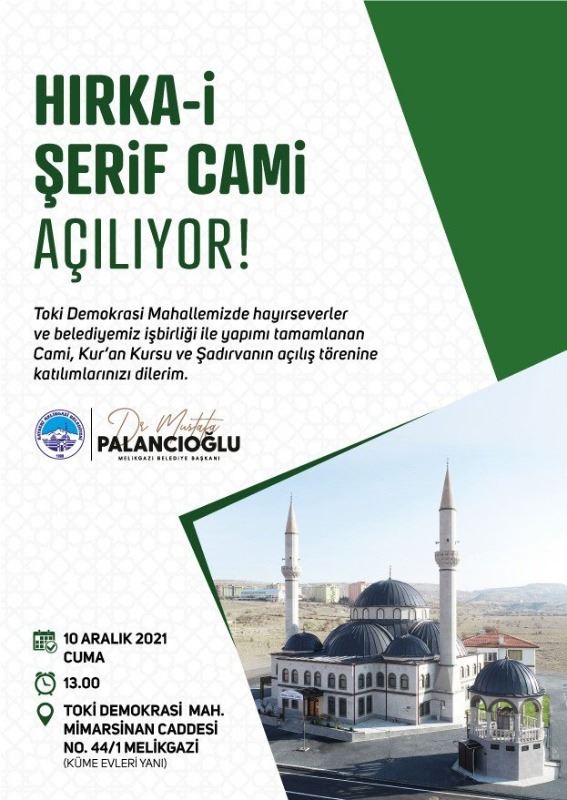 Melikgazi Belediyesi, TOKİ Demokrasi Mahallesi’nde hayırseverler işbirliği ile yapımı tamamlanan Hırka-i Şerif Cami, Kuran Kursu ve Şadırvan’ın açılış törenini gerçekleştirecek.