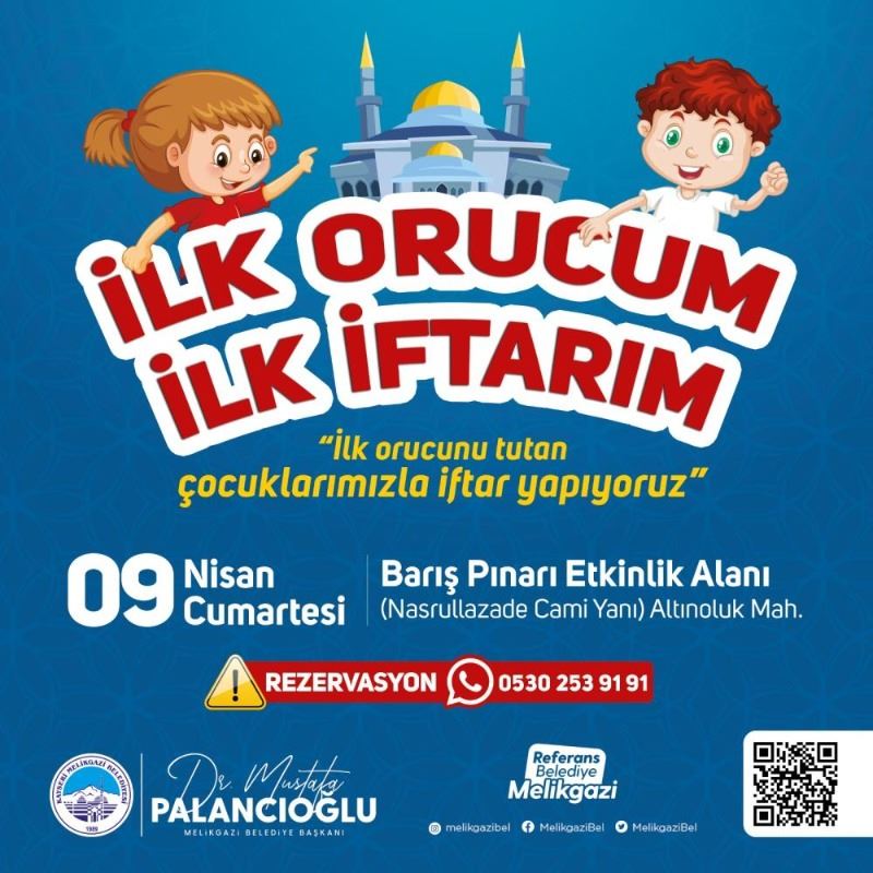 09 Nisan Cumartesi günü Barış Pınarı Etkinlik alanında düzenlenecek iftar hakkında bilgi veren Melikgazi Belediye Başkanı Dr. Mustafa Palancıoğlu; “Melikgazi Belediyesi olarak farklı etkinlikler yapıyoruz. Gençliğimize de, çocuklarımızı da sahip çıkmamız lazım. Onlara da Ramazan'ın bereketini, huzurunu ve güzelliğini yaşatmak istiyoruz. Bu sene ilk defa Melikgazi Belediyesi olarak ‘İlk Orucum İlk İftarım’ adı altında güzel bir program başlatıyoruz. Farklı mahallelerde hava şartları müsaade ettiği sürece yapacağımız bir uygulama olacak. 09 Nisan Cumartesi günü Altınoluk Mahallemizde Nasrullahzade Cami’nin yanında yeni oluşturduğumuz 2 senedir kullanımda olan Barış Pınarı Etkinlik alanında piknik havasında bir iftar yapacağız. Dolayısıyla ilk orucunu tutacak ilk iftarını açacak çocuklarınızla misafirimiz olabilirsiniz. Ramazan'ı, iftarı birlikte geçirebiliriz. Rezervasyon için lütfen belediyemizin web sitesinden veya İletişim Merkezinden ya da 0530 253 91 91 whatsapp numaramıza yazarak rezervasyon yapabilirsiniz. Etkinliğimizin hayırlara vesile olmasını diliyorum. Gençliğe güzel örnekler olacağız. Cenab-ı Allah tuttuğumuz oruçları yaptığımız ibadetleri kabul eylesin” dedi.