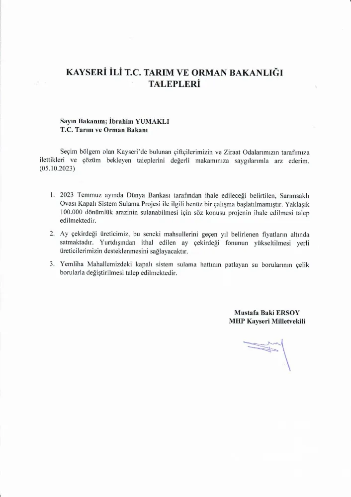 "Tarım ve Orman Bakanımız Sayın İbrahim Yumaklı'yı ziyaret ederek, Kayserili çiftçilerimizin taleplerini ilettik. 2023 Temmuz ayında Dünya Bankası tarafından ihale edileceği belirtilen, Sarımsaklı Ovası Kapalı Sistem Sulama Projesi ile ilgili henüz bir çalışma başlatılmamıştır. Yaklaşık 100 bin dönümlük arazinin sulanabilmesi için söz konusu projenin ihale edilmesi talep edilmektedir. Ay çekirdeği üreticimiz, bu seneki mahsullerini geçen yıl belirlenen fiyatların altında satmaktadır. Yurtdışından ithal edilen ay çekirdeği fonunun yükseltilmesi yerli üreticilerimizin desteklenmesini sağlayacaktır.Yemliha Mahallemizdeki kapalı sistem sulama hattının patlayan su borularının çelik borularla değiştirilmesi talep edilmektedir."