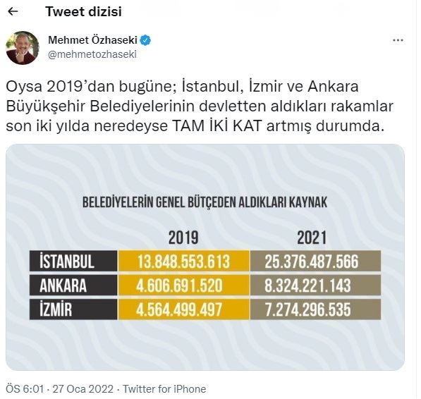 AK Parti Genel Başkan Yardımcısı ve Kayseri Milletvekili Mehmet Özhaseki sosyal medya hesabından yaptı açıklamada CHP’nin 11 Büyükşehir Belediye Başkanın çevrimiçi toplanıp söz verip yapamadıkları hizmetler için nasıl bahane üreteceklerini tartıştıklarını duyurup “Başarısızlığınıza bahane aramaktan vazgeçin, enerjinizi vatandaşa hizmet etmek için neler yapabileceğinize harcayın” dedi ve ekledi “ “Paramız yok, devlet para versin” bahanesine sarılmışlar. Oysa 2019’dan bugüne; İstanbul, İzmir ve Ankara Büyükşehir Belediyelerinin devletten aldıkları rakamlar son iki yılda neredeyse TAM İKİ KAT artmış durumda.