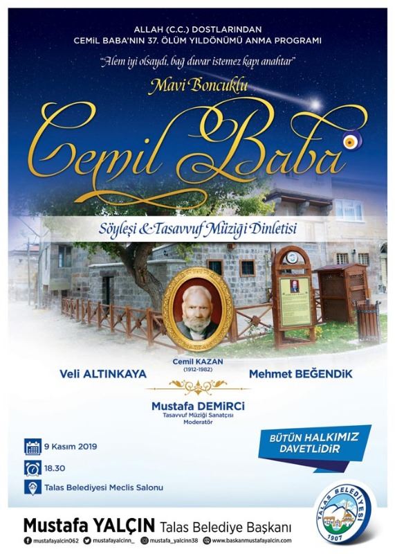 Talas Belediyesi, merhum Cemil Baba için söyleşi ve tasavvuf müziği dinletisinin yer alacağı anma gecesi planladı. 9 Kasım Cumartesi saat 18.30’da Talas Belediyesi Meclis Salonu’nda gerçekleşecek programda Cemil Baba’nın hayatına tanıklık eden Kayseri Gazeteciler Cemiyeti Başkanı Veli Altınkaya ve Mehmet Beğendik anılarını anlatacak. Tasavvuf müziği sanatçısı Mehmet Demirci ise söyleşinin hem moderatörlüğünü yapacak hem de ilahilerden oluşan konser verecek. Programa bütün vatandaşlar katılabilecek.