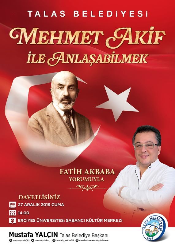 Erciyes Üniversitesi (ERÜ) Sabancı Kültür Merkezi’nde gerçekleşecek konferansta Mehmet Akif Ersoy’un hayatı ve eserlerinin yanı sıra fikirlerinin günümüze uzanan yansımaları üzerinde durulacak.