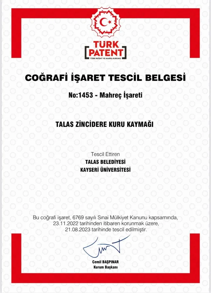 Talas Zincirdere Kuru Kaymağı, Talas Belediyesi ve Kayseri Üniversitesi ortaklığında Türk Patent ve Marka Kurumuna yapılan başvuru sonrasında 'Talas Zincirdere Kuru Kaymağı' adı altında tescil edildi. Yerel yönetimlerle işbirliği içinde çalışmalarda bulunan Kayseri Üniversitesi'nin Develi Belediyesi ile yaptığı başvuru sonrası Develi yöresinde yetişen Gacer Ata Buğdayı da 'Develi Gaceri' adı altında geçen yıl Haziran ayında tescil ettirilmişti.