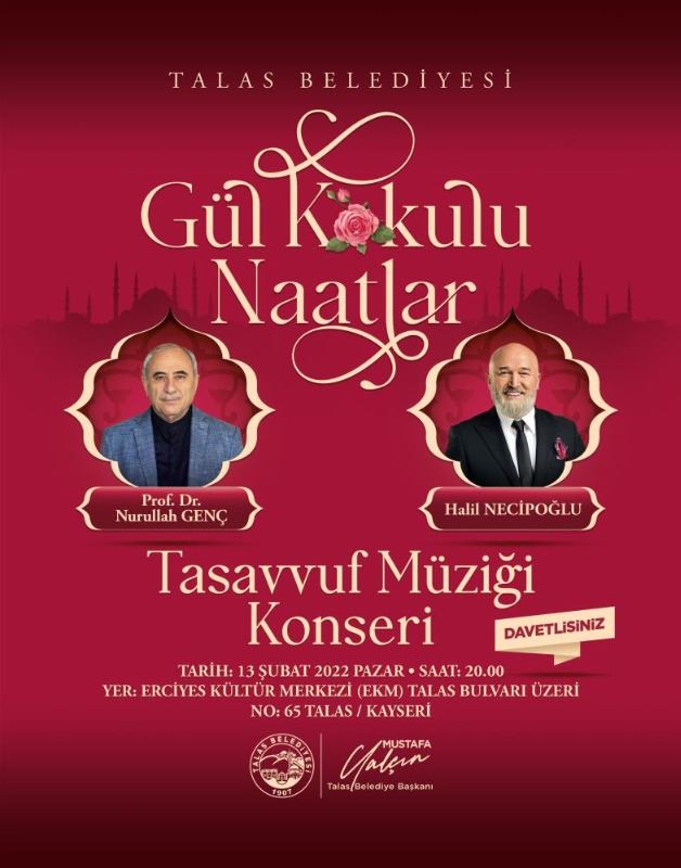 Talas Belediyesince tertiplenen ‘Gül Kokulu Naatlar’ programına sayılı saatler kala, Talas Belediye Başkanı Mustafa Yalçın, bütün Kayserilileri şiir ve ilahi programına davet etti.