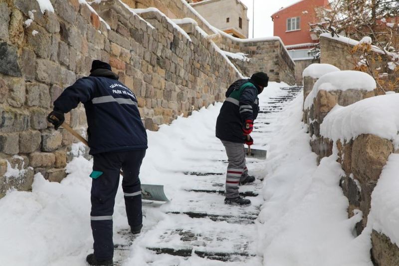 Kış mevsimiyle birlikte ilçe merkezi ve kırsal mahallelerde hummalı bir kış çalışması yürüten Talas Belediyesi ekipleri bir taraftan yollarda kar ve buzlanmaya karşı temizlik ve tuzlama çalışması sürdürürken diğer taraftan da yaya yolları ve ara sokaklardaki merdivenlerde biriken karları ve buzları temizliyor.