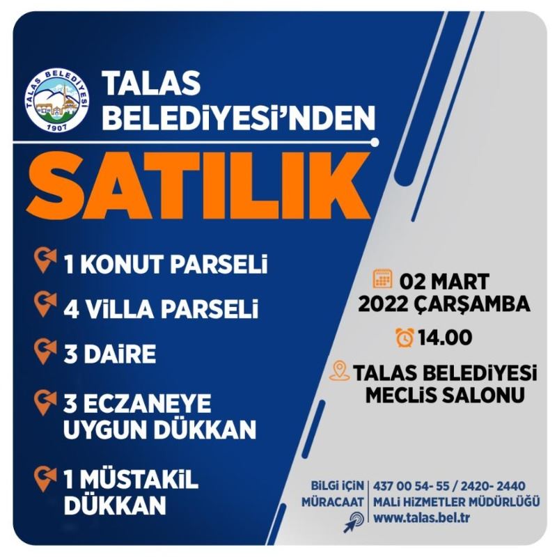 Talas Belediyesi’nin gerçekleştireceği hizmet ve yatırımlarda kaynak olarak kullanılacak taşınmazların satışını içeren ihale, 02 Mart 2022 Çarşamba günü saat 14.00’te Belediye Meclis Salonu’nda gerçekleştirilecek. 3 dairenin yanı sıra 4 villa parseli ile 3’ü eczaneye uygun olmak üzere 4 dükkanın satışa sunulacağı ihaleler kapsamında 1 adet de konut parseli alıcısını bulacak.