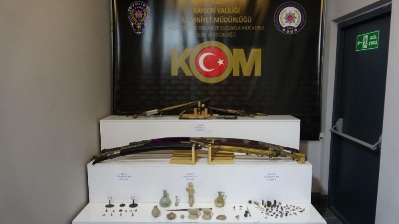 Edinilen bilgiye göre, Kayseri İl Emniyet Müdürlüğü Kaçakçılık ve Organize Suçlarla Mücadele Şube Müdürlüğü Kaçakçılık Suçları Büro Amirliği ekipleri tarafından tarihi eser kaçakçılığı suçlarının tespiti, eserlerin yurtdışına kaçırılmasının önlenebilmesi ve faillerinin yakalanmasına yönelik çalışma başlatıldı. Yapılan çalışmalar neticesinde Talas ilçesinde bulunan bir ikamette yapılan aramalarda İslami Dönem, Bizans Dönemi ve Roma Dönemine ait kılıç, kasatura, kama, mühür, toprak obje, sikke, heykel gibi toplam 150 adet tarihi eser obje ve 1 adet tabanca bulundu.