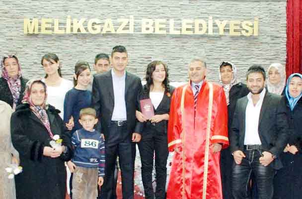 önceden randevu alınmış. Ancak önemli olan eşlerin sevdikleri ile birlikte hayırlı bir ömür sürmeleridir" dedi. Melikgazi Belediyesi olarak 5 ayrı yerde nikah işlemlerini yerine getirdiklerini ve verilen randevu olarak bugün akşam 23.15'ekadar 55 nikah işleminin yerine getirileceğini ifade eden Büyükkılıç, Melikgazi Belediyesi Merkez Nikah salonunda saat 11.11'de Elif Özcan ile Gökhan Çıtırkı'nın nikah işlemlerinin yerine getirildiğini sözlerine ekledi.