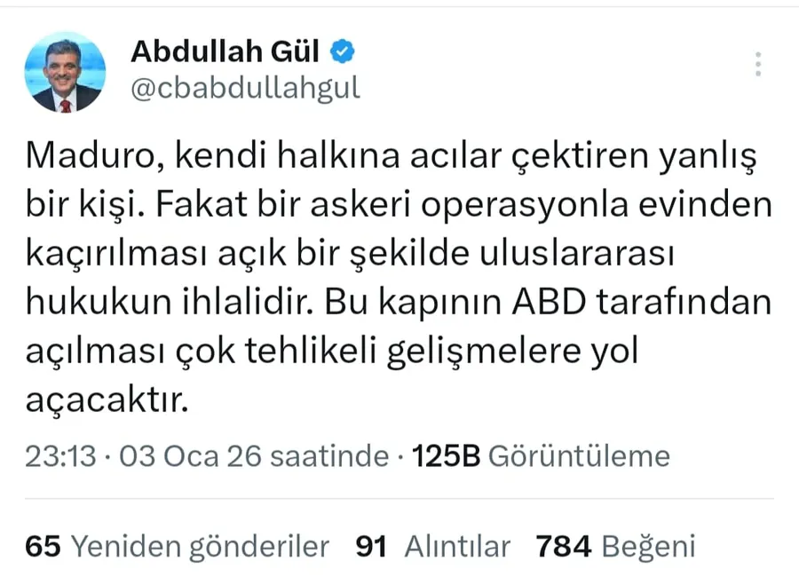 Sosyal medya hesabından açıklama yapan Gül, Maduro’nun kendi halkına yanlışlar yapan bir lider olduğunu vurgulamakla birlikte, yaşanan yöntemin kabul edilemez olduğunu belirtti. Gül paylaşımında,