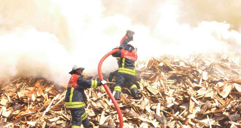 bir orman ürünleri fabrikasının bahçesinde bulunan kalaslar alev aldı. Yangına