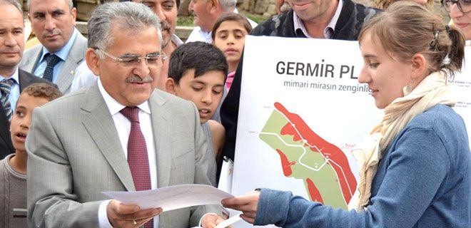 Germir’de bulunan bir oyun parkında düzenlenen çalıştaya, Melikgazi Belediye Başkanı Memduh Büyükkılıç, Kayseri Büyükşehir Belediyesi Kültür ve Sosyal İşler Daire Başkanı Oktay Durukan, 10 Türk, 9 Fransız öğrenci ve Germir halkı katıldı. Çalıştayda çocuklar için oyun alanı yeniden düzenlendi. Oyun alanının düzenlenmesinde doğal malzemeler kullanıldı. Etkinlikte konuşan Melikgazi Belediye Başkanı Memduh Büyükkılıç, “Burada Germir ve Tavlusun bölgesini birlikte değerlendiriyoruz. Dolayısıyla Kayserimizin tarihinde önemli bir yeri olan gerek dini gerekse tarihi açıdan üzerinde duruyoruz. Ancak bugüne kadar planlamasında maalesef daha yeni sonuç aldığımız bir bölge. Bu süreçte gerek Germir’de gerekse Tavlusun’da özellikle tarihi yapıların uygun şekilde yapılmasına zemin hazırlayacak bir ortamı önümüzdeki süreçte göreceksiniz. Bu anlamda gerek muhtarımıza gerekse bizlere çok iş düştüğü kanaatindeyim” diye konuştu.