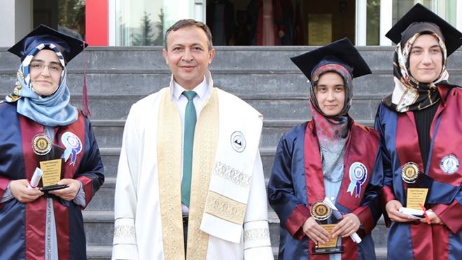 Saygı Duruşu, İstiklal Marşı ve Kuran-ı Kerim Tilaveti’nin ardından mezuniyet töreninin açılış konuşmasını yapan İlahiyat Fakültesi Dekanı Prof. Dr. Ahmet Kamil Cihan yaptığı konuşmasında Fakülteleri hakkında bilgiler verdi. Dekan Cihan, “Sevgili mezunlarımız, hepiniz bin bir emekle zahmetle geçen 5 yılın ardından bu mutlu günlere ulaştınız ve bu günlere ulaşmanın arkasında ailenizin desteğini ve hocalarınızın üstün gayretini unutmamanızı rica ediyorum. Değerli arkadaşlar, aldığınız ilahiyat tahsilinin öncelikle sizlere hayırlı ve faydalı olmasını temenni ediyorum. Kazandığınız bu birikimi hayatınıza taşıdığınızda her şeyin nasıl kolay bir hale geldiğini bizzat göreceksiniz” dedi. Rektör Prof. Dr. Mustafa Çalış ise konuşmasında mezun öğrencileri tebrik etti. Rektör Çalış, şunları kaydetti: “İslam’ın temel kaynaklarına hâkim olan ve bilimsel bilgiyi temel alan genç mezunlarımız olarak Ülkenize, Vatanınıza ve Milletinize hizmet edeceğinize inancımız tamdır. Bende bir İmam hatip mezunu olarak sizlere şunu belirtmek isterim ki; genç kuşakların dini eğitim alanında gerekli donanım ve dini bilgilere sahip olmaları için sizlere düşen görev büyük önem arz etmektedir. Şunu unutmayın ki; sizler, fakültenizden aldığınız bilgi ve birikimler ile genç kuşaklara İslam’ı her alanıyla aktararak genç kuşaklarımızın rol modeli olacaksınız. Çok ulvi bir mesleğin mensubu olacaksınız ama aynı zamanda sorumluluğunuz ve yüklendiğiniz görev çok ama çok büyük bunun idrakın da olacağınıza inancım tamdır. Dini bilgiyi çağın ihtiyaçları doğrultusunda anlayan ve sorumluluk sahibi bireyler olarak Ülkemizin 11 araştırma üniversitesi arasında yer alan saygın, köklü ve gelenekleri olan Erciyes Üniversitesi’nden mezun oluyorsunuz. Yükseköğretim Kalite Kurulu (YÖKAK) tarafından Türkiye'de yükseköğretim alanında ilk kez uygulanan “Kurumsal Akreditasyon Programı” kapsamında 5 yıl süreyle “tam akreditasyon” almaya hak kazanan sayılı üniversitelerden birisi olan Erciyes Üniversitesi’nin birer mezunu olarak sizler, Erciyes Üniversitesi kimliğini gururla taşıyabilirsiniz.” Konuşmaların ardından tören, mezun öğrencilere diploma ile plaket takdiminin ardından sona erdi.
