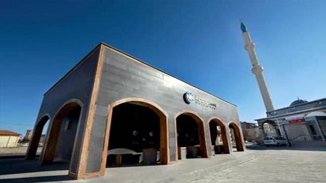 Öte yandan Selçuklu mimarisinden esintiler taşıyan, aynı zamanda son derece modern çizgilere sahip olan ve ortalama 100 metrekareden oluşan kemerli şadırvanların içerisinde; erkek ve kadın lavaboları, engelliler için farklı bir bölüm, 16 tane abdest alma yeri ve bunun yanında son teknolojiyle donatılmış yüz litre kapasiteli sıcak su bölümü bulunuyor.