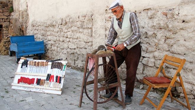Kayseri'nin Tomarza ilçesinde 85 yaşındaki Mustafa Turan, 1955 yılında demircide yaptırdığı bıçak bileme çarkıyla zorluklar içinde köy köy gezerek bıçak bileyip ailesinin geçimini sağladı