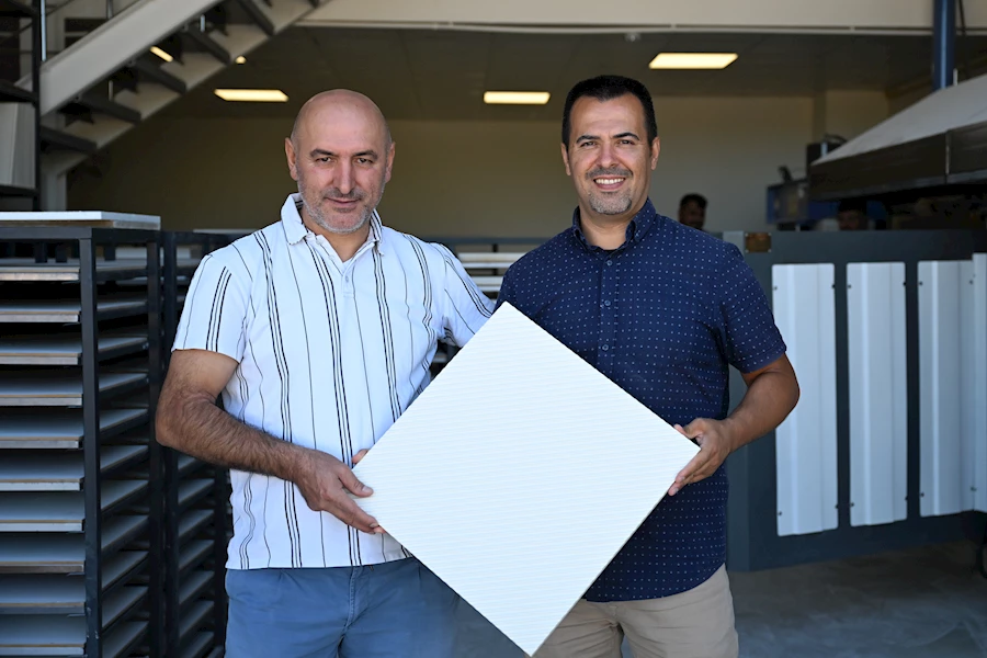 Erciyes Teknopark bünyesinde kurdukları şirketlerinde yaptıkları birbirinden farklı plakaları 1350 derece sıcaklıkta fırınlarda pişirdiklerini anlatan Şendoğdular, bu kapsamda piyasada mevcut en yüksek dayanımlı plakaya sahip olduklarını belirtti.