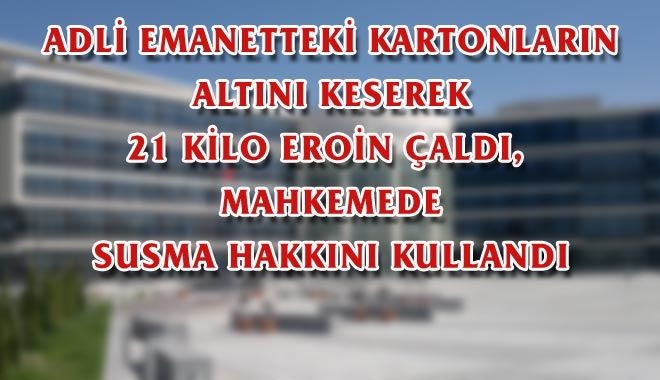 Kayseri Adalet Sarayı´nda adli emanette kartonların altını keserek yaklaşık 1 milyon TL değerinde 21 kilo eroini çalıp, piyasaya sokmak isterken yakalanan ve ´uyuşturucu madde ticareti yapma´ suçundan tutuklu yargılanan adli emanet memuru ile birlikte 13 sanık ilk kez hakim karşısına çıktı. Adli emanet memuru, duruşmada susma hakkını kullandı.