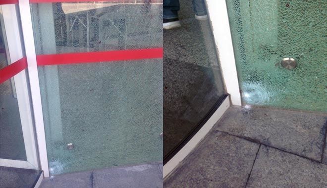 Kayseri Adalet Sarayı önünde iki grup arasında çıkan kavga sırasında, bir kişi yanında bulunan silahla Adliye binasının camını kırdı.