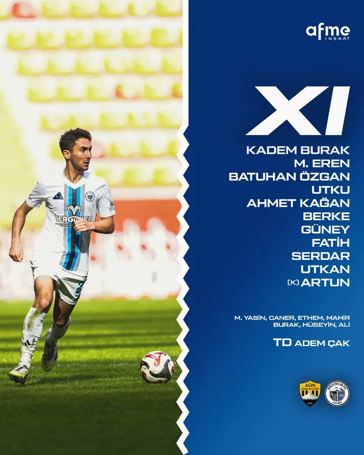 Türkiye Futbol Federasyonu 3. Lig 2. Grup karşılaşmasında Erciyes 38 FK, deplasmanda Ağrı 1970 ile karşı karşıya gelecek. Vali Lütfü Yiğenoğlu Stadyumu’nda oynanacak mücadele öncesinde mavi-siyahlı ekibin ilk 11’i açıklandı.