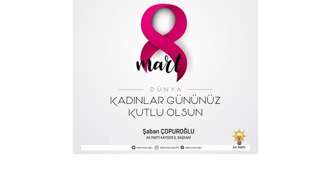 AK Parti il başkanı Şaban Çopuroğlu 8 mart emekçi kadınlar günü sebebiyle yaptığı açıklamada şu görüşlere yer verdi: “ 8 Mart Dünya Emekçi Kadınlar Günü, kadının hayatın içindeki konumunun ve değerinin vurgulandığı ayrıca kadın sorunlarına karşı farkındalığı arttırmak amacıyla kutlanan uluslararası bir gündür. Ülkemizde kadın, gerek milli mücadele gerekse kalkınma mücadelesinin gizli kahramanıdır. Başta ekonomik alanda olmak üzere sosyal, siyasal ve kültürel alanda verdiği kutsal mücadelesinde kadının yanında olmak, onu desteklemek hepimizin görevidir. Ülkemizde kadınlarımız ekonomiden siyasete, eğitimden ticarete kadar birçok alanda kalkınmaya katkı sağlamaktadırlar. Kadının bir birey olarak kendi sorunlarına çözüm aramasının ve doğasının bir parçası olan gücünü ortaya çıkarmasının, güçlü bir Türkiye için gerekli olduğuna inanıyoruz. Geçmişten günümüze tarihe adını altın harflerle yazdırmış Türk kadını bundan sonra da dünyaya medeniyetin gücünü gösterecektir. Bu minvalde tüm kadınlarımızın 8 Mart Dünya Kadınlar Gününü kutluyor, sevgi ve saygılarımı sunuyorum”