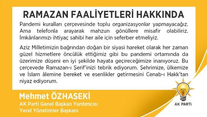 AK Parti Yerel Yönetimlerden Sorumlu Genel Başkan Yardımcısı ve Kayseri Milletvekili Mehmet Özhaseki imzasıyla AK Partili belediyelere gönderilen Ramazan genelgesinde Belediye Başkanlarının Ramazan ayı tebrik edilerek “Biliyoruz ki; bu mübarek ayda bereket kapıları açılır. Hayırseverlik, iyilikseverlik, yardımseverlik, diğergâmlık duyguları en doruk noktaya ulaşır. Paylaşmanın verdiği mutluluk ve manevi haz en fazla Ramazan ikliminde anlam bulur. Ramazan, hayatımıza yeni bir düzen kurar. Ramazan ayında insan; nefsinin ihtiyaçlarını disiplin altına alırken ruhunu basamak basamak yükselteceği bir imkân elde eder. Bu yükseliş, tek başına yürütülen bir sefer değildir. Mü’minlerin bir bütün olarak; fakiriyle, zenginiyle, ihtiyarıyla genciyle, çaresiz ve kimsesizleriyle birlikte bir topyekûn yükseliştir” değerlendirmesinde bulunuldu. Belediye Başkanlarına bu ay için şehirleri ulvi hissiyatın merkezi haline getirmelerini söyleyen Genel Başkan Yardımcısı Özhaseki, “Şehirlerimizi kardeşlik ve dostluk merkezi, fakir ile zenginin buluştuğu bir mekân, yaratılmışlara olan sevgimizin adeta taşıp coştuğu bir belde haline getirmeliyiz” ifadelerini kullandı.