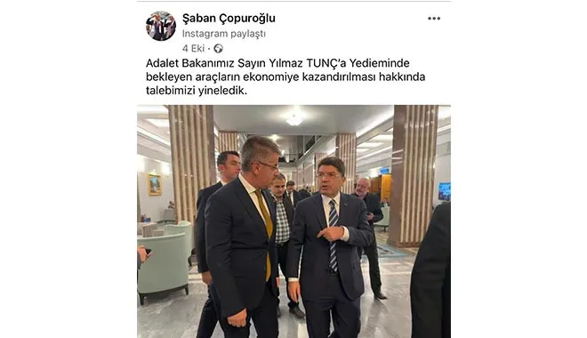 AK Parti Kayseri Milletvekili Şaban Çopuroğlu; bir süre önce Adalet Bakanı Yılmaz Tunç ile yedieminde bekleyen araçların ekonomiye kazandırılması hakkında görüşmüştü.