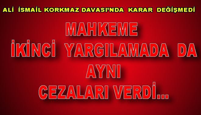 Eskişehir´deki Gezi Parkı eylemleri sırasında hayatını kaybeden Ali İsmail Korkmaz davasında mahkeme ikinci yargılamada da aynı cezaları verdi. Tutuklu