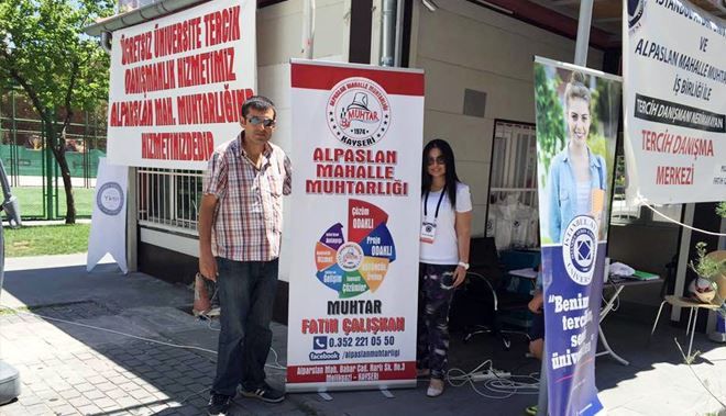 Melikgazi ilçesi Alparslan Mahallesi Muhtarı Fatih Çalışkan, muhtarlık önüne kurduğu stant ve uzmanlar eşliğinde öğrencilere ücretsiz tercih yapma hizmeti veriyor.