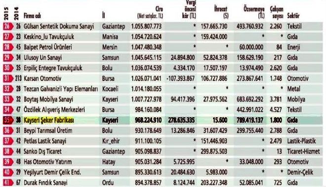 3 büyük il dışında Anadolu´nun 500 büyük dev şirketleri sıralamasında 2014 yılında 38´inci sırada bulunan Kayseri Şeker, 2015 yılı sıralamasında 35´inci sıraya yükseldi.