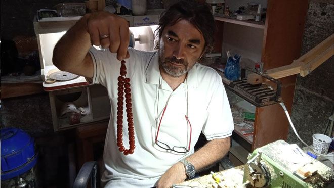 15 yıldır tesbih işi ile uğraşan Mustafa Kalaycıgil, 5 bin dolar fiyat biçtiği 100 yıllık kehribar tesbihine alıcı bekliyor.