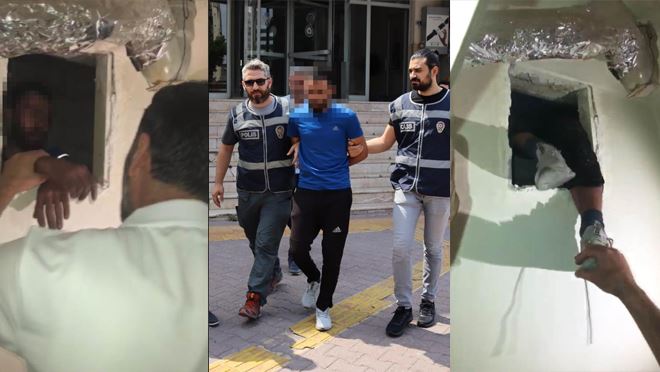 Kayseri'de kesinleşmiş hapis cezası bulunan şahıs, yakalanacağını anlayınca havalandırma boşluğuna saklandı. Ekipler yaptıkları aramada şahsı havalandırma boşluğunda yakalarken, bir polis ise, "Hadi gel, çok terlemişsin orada" dedi.