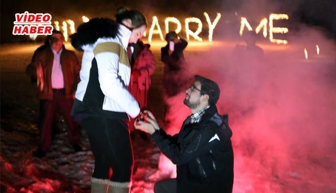 Metal, çok büyük harflerle dağa,İngilizce ´Will u marry me´ yazan ve harflerin ateşlenmesiyle bütün dağda görünen evlenme teklifi yazısının önüne damat adayı Evrim Ünal,snowboardla kayarak geldi. Sonra İngiliz kızın parmağına yüzük takarak, evlilik teklif etti. Birlikteliklerini patlatıkları şampanya ile kutlayan Evrim Ünal ve Ellen bu mutluluklarını aileleri ve yakın dostları ile birlikte paylaştılar.