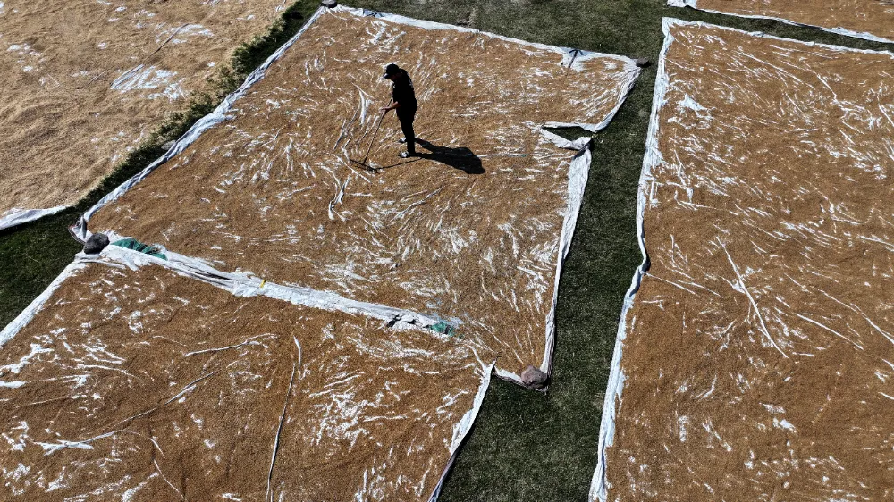 Hedik olarak yenen buğdaydan kalan kısmını harmana seren aile, kuruyan hedikleri taş değirmene götürüp bulgur haline dönüştürüyor.