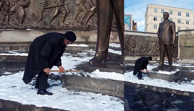 Kayseri´de iki gündür etkili olan soğuk hava ve kar yağışı kenti beyaza bürürken, Cumhuriyet Meydanı´nda bulunan Atatürk Anıtı önünde bir kişinin davranışı büyük takdir topladı. Adının ´Yusuf´ olduğu öğrenilen kişi, Atatürk Anıtı önünde biriken karları bastonuyla temizledi. Görenleri duygulandıran olay, cep telefonuyla görüntülendi.