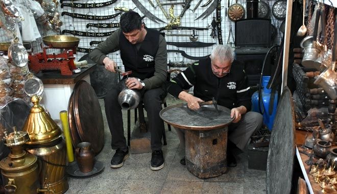 Eski Sanayi Sitesi´nde yıllardır aynı çatı altında omuz omuza bakır işlemeciliği yaparak çekiç sallayan baba-oğul, mesleklerini geleceğe taşımak için adeta bir köprü görevi görüyor.