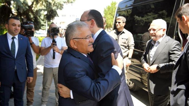 Ticaret Bakanı Mehmet Muş, Kayseri Büyükşehir Belediye Başkanı Memduh Büyükkılıç’ı makamında ziyaret etti. Başkan Büyükkılıç Kayseri’nin ticaretin yasalarının yazıldığı 6 bin yıllık şehir olduğunu söylerken, Bakan Muş da Başkan Büyükkılıç’a yaptığı yatırım ve hizmetlerden dolayı tebrik ve teşekkürlerini iletti.