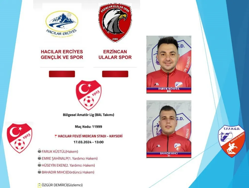 Türkiye Futbol Federasyonu, Bölgesel Amatör Lig 11. Grup'ta oynanacak 20.hafta maçlarını yönetecek hakemlerin isimlerini kamuoyu ile paylaştı. Türkiye Futbol Federasyonu; Dersimspor-Bingöl Gençspor, Hacılar Erciyesspor-Erzincan Ulalarspor, 12 Bingölspor-Aksaray Gençlikspor ve Rüstempaşaspor-Develigücü maçlarını yönetecek hakemlerin isimlerini açıkladı.