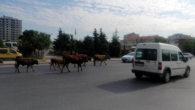 Edinilen bilgiye göre, ilçeye bağlı Yeniköy Mahallesi Şehit Piyade Astsubay Serkan Ciddioğlu Caddesi üzerinde trafiğin yoğun olduğu saatlerde yola çıkan başıboş büyükbaş hayvan sürüsü sürücülere zor anlar yaşattı. Yol ortasında ilerleyen sürü, araçların önüne çıkarak trafiği engelledi. Sürücüler de kornaya basarak hayvanları yoldan çıkarmak için uğraştı.