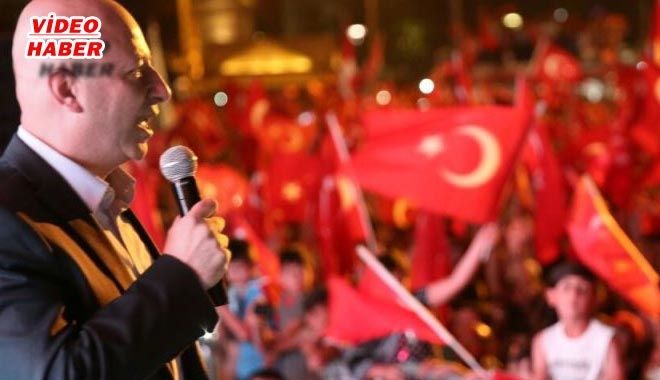 Darbe girişiminin ilk dakikalarından itibaren demokrasiye ve milli iradeye sahip çıkarak destan yazan aziz hemşehrilerim? O gece; dosta güven veren, düşmana korku salan duruşumuz ile düşmanlara, hainlere, teröristlere bu topraklar bin yıldır bu aziz millete vatan olmuştur ve inşallah kıyamete kadar vatan kalacaktır dedik.