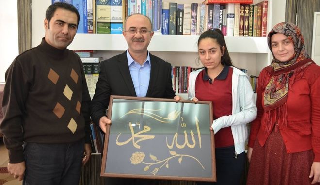 Namık Kemal Ortaokulu öğrencisi Yurdagül Yıldız sarı ve mavi haşhaştan yaptığı tehzip eserini Başkan Şinasi Gülcüoğlu´na hediye etti.