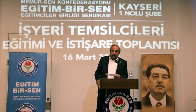 "Büyük Eğitim Bir Sen´in onurlu üyeleri olarak ülkemize ve sendikamıza hizmet etmeye gayret edeceğiz ve çalışacağız. Üyesinin ve ülkesinin sorunlarına duyarlı hedefi ve çalışmaları ile tutarlı bir sendika olarak nerede bir gözyaşı ve nerede bir feryat varsa oraya kulak kabartıyor el uzatıyor insan ve İslam olmanın gereğini yerine getiriyoruz. 15 Mayıs bizim için çok önemli. Sayıların sayıldığı, yetkinin belirlendiği, 2006´dan beri Kayseri´de yetkili sendikayız. 2011 den beri ise gene yetkili sendikayız. Yetkili olmak sendikacılıkta çok önemli, yetkili iseniz masada sizin gündeminiz konuşuluyor. Kazanımlarımıza bakıldığı zaman kesintisiz eğitimin 4+4 ?e geri getirilmesi, baş örtüsü yasağı, Cuma namazında izin gibi bir çok kazanılan imza attık. İnşallah bundan sonra da sizinle birlikte bir çok kazanıma imza atacağız. Bu süreçte yetki konusunda bir sıkıntı yok ama Kayseri´de 3 bin 500 civarında ulaşamadığımız ve sendikamıza üye yapamadığımız, düşüncesi bizim gibi olan arkadaşlarımız var. ´Sendika ne işe yarar´ düşüncesinde olan arkadaşlarımıza 15 Mayıs mütabakat metninden önce hepimize görev düşüyor. Burada yaklaşık 400 kişi oluyoruz, 400 tane iş yeri temsilcimiz. 15 Mayıs mutabakatına kadar yani bir buçuk ay süre var her biriniz birer üye yazarsa sayımız daha da artacak inşallah. 2020-2021 yılının toplu sözleşme masası biliyorsunuz Ağustos ayında kurulacak. Orada genel merkezimiz bizleri daha güçlü temsil etmek için mutlak suretle illerimiz de üye yazımının devam etmesi gerekiyor. Bundan dolayı 15 Mayısa kadar sizlerden birer tane üye sözü almak istiyorum."