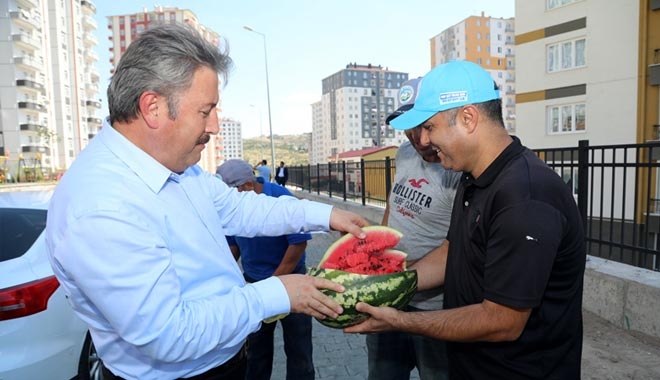 Çalışmalar hakkında bilgi alan Başkan Palancıoğlu, sıcakta özveriyle çalışan İşçilere serinlemeleri ve enerji sağlaması için karpuz ikram etti.