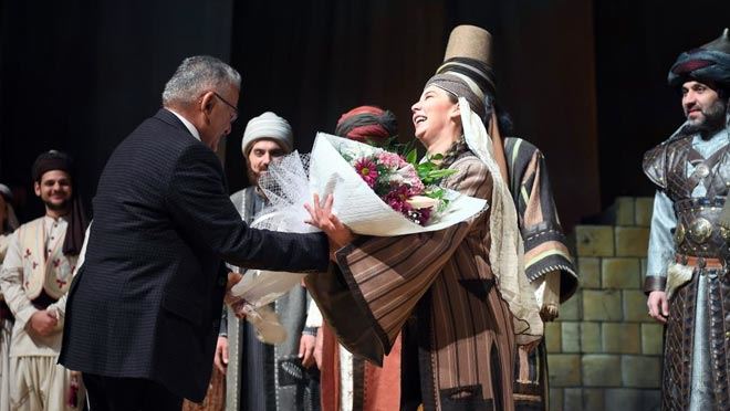 Kayseri Büyükşehir Belediye Başkanı Dr. Memduh Büyükkılıç'ın Ankara'da yaptığı çalışmalar sonucunda kurulan Kayseri Devlet Tiyatrosu’nda sahne alan, Remzi Özçelik’in kaleme aldığı Hacı Bektaş tiyatro oyunu tiyatroseverler tarafından yoğun ilgi görürken, Büyükşehir Belediye Başkanı Dr. Memduh Büyükkılıç da oyunu eşi Dr. Necmiye Büyükkılıç ile birlikte izledi. Oyun sonunda İzmir Devlet Tiyatrosu sanatçılarına çiçek takdim eden Başkan Büyükkılıç, burada yaptığı konuşmada Devlet Tiyatroları Genel Müdürlüğü ve Kayseri İl Kültür ve Turizm Müdürlüğü’ne böyle güzel bir eserle Kayseri’yi buluşturdukları için teşekkür etti.